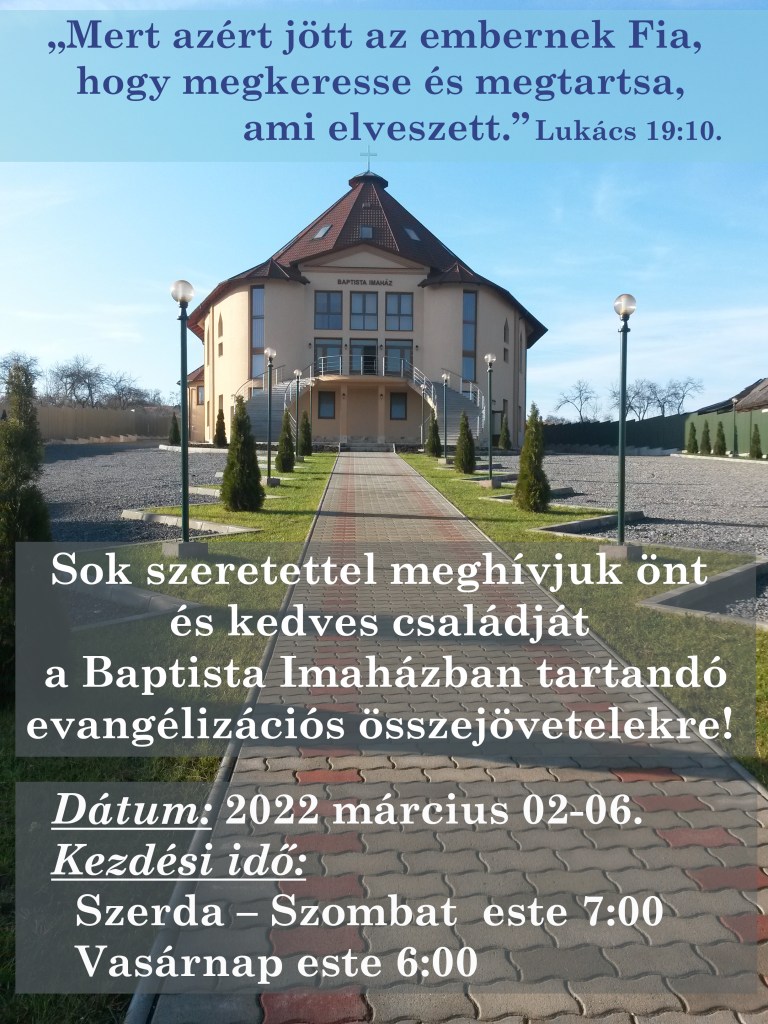 Sok szeretettel meghívjuk önt és kedves családját a Baptista Imaházban tartandó evangélizációs összejövetelekre!